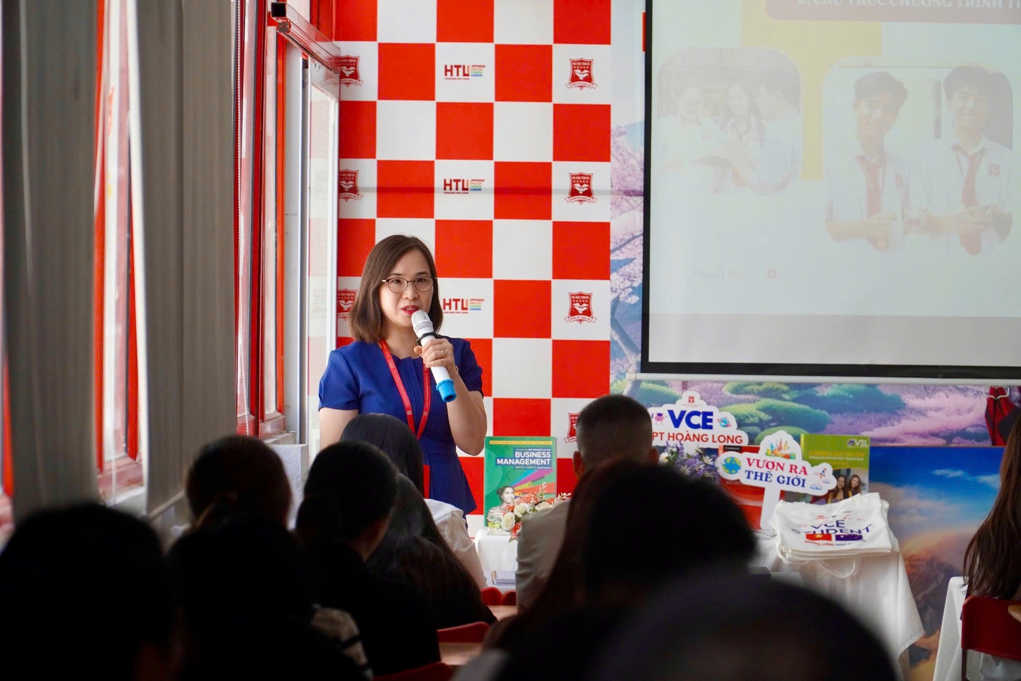 Phát biểu tại hội thảo, đại diện Ban giám hiệu nhà trường nhấn mạnh vai trò quan trọng của việc định hướng nghề nghiệp từ sớm trong việc hình thành mục tiêu học tập, phát triển kỹ năng và định hình tương lai nghề nghiệp cho học sinh. Trong khuôn khổ chương trình, Trường THPT Hoàng Long đã giới thiệu chi tiết các hệ đào tạo đang được triển khai, bao gồm: Hệ Khoa học Xã hội, Hệ Khoa học Tự nhiên, Hệ Ngoại ngữ và đặc biệt là Hệ Song bằng Việt – Úc (VCE).
