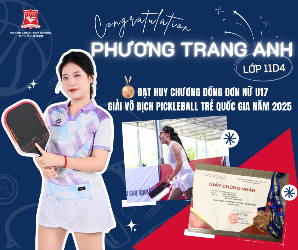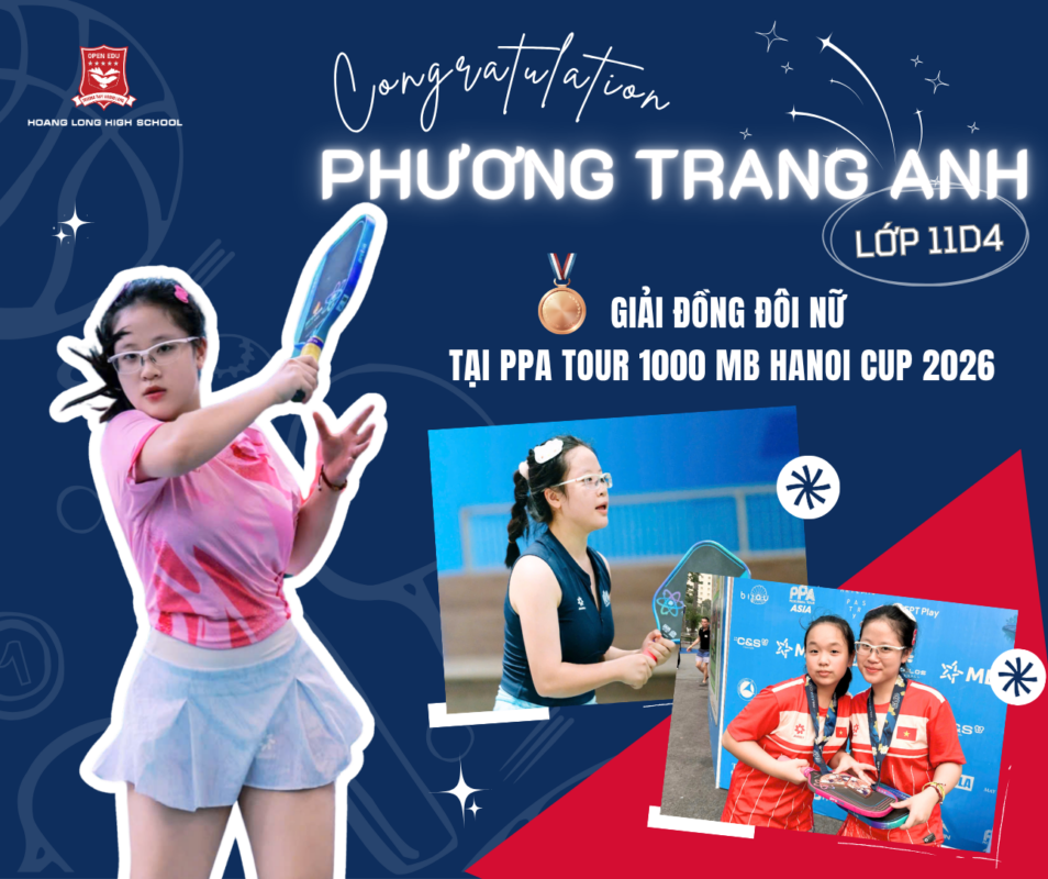 Trong hành trình khẳng định bản thân và theo đuổi đam mê thể thao, học sinh Trường THPT Hoàng Long tiếp tục ghi dấu ấn ấn tượng trên đấu trường lớn. Phương Trang Anh lớp 11D4 đã xuất sắc giành Giải Đồng nội dung đôi nữ tại PPA Tour 1000 MB Hanoi Cup 2026 – một giải đấu quy mô lớn thuộc hệ thống PPA Asia hội tụ tay vợt hàng đầu như Lý Hoàng Nam, diễn ra tại Cung Điền kinh trong nhà Mỹ Đình (Hà Nội) với sự tham gia của hơn 500 vận động viên.