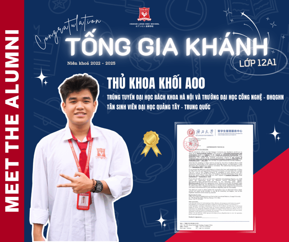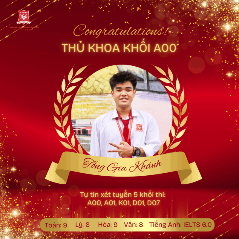 Với thành tích trở thành thủ khoa khối A00, sở hữu chứng chỉ IELTS 6.0, cùng học bổng quốc tế danh giá, Tống Gia Khánh – 12A1 chính là niềm tự hào của mái trường Hoàng Long. Em là minh chứng cho tinh thần dám nghĩ, dám làm, dám vươn xa của thế hệ học sinh Hoàng Long hôm nay và mai sau.
